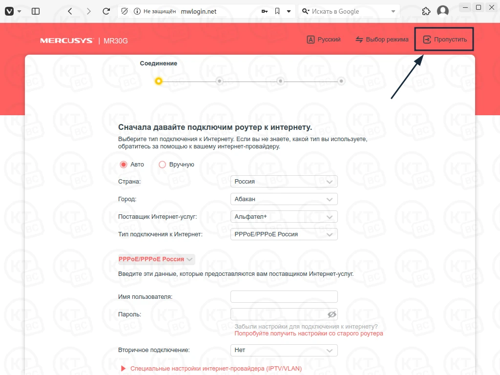 Тип подключения к Интернет: PPPoE/PPPoE Россия